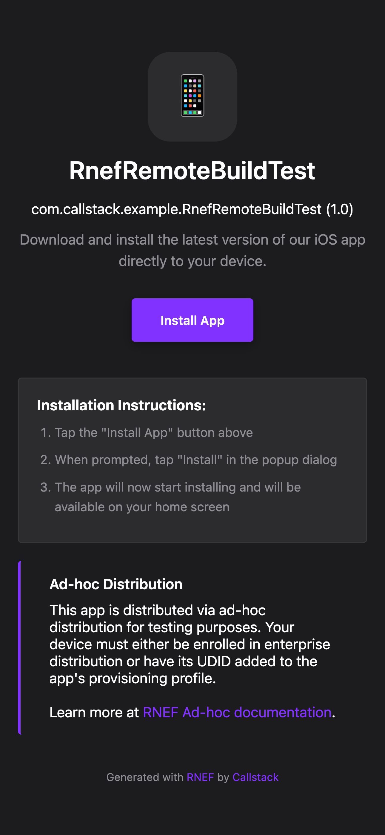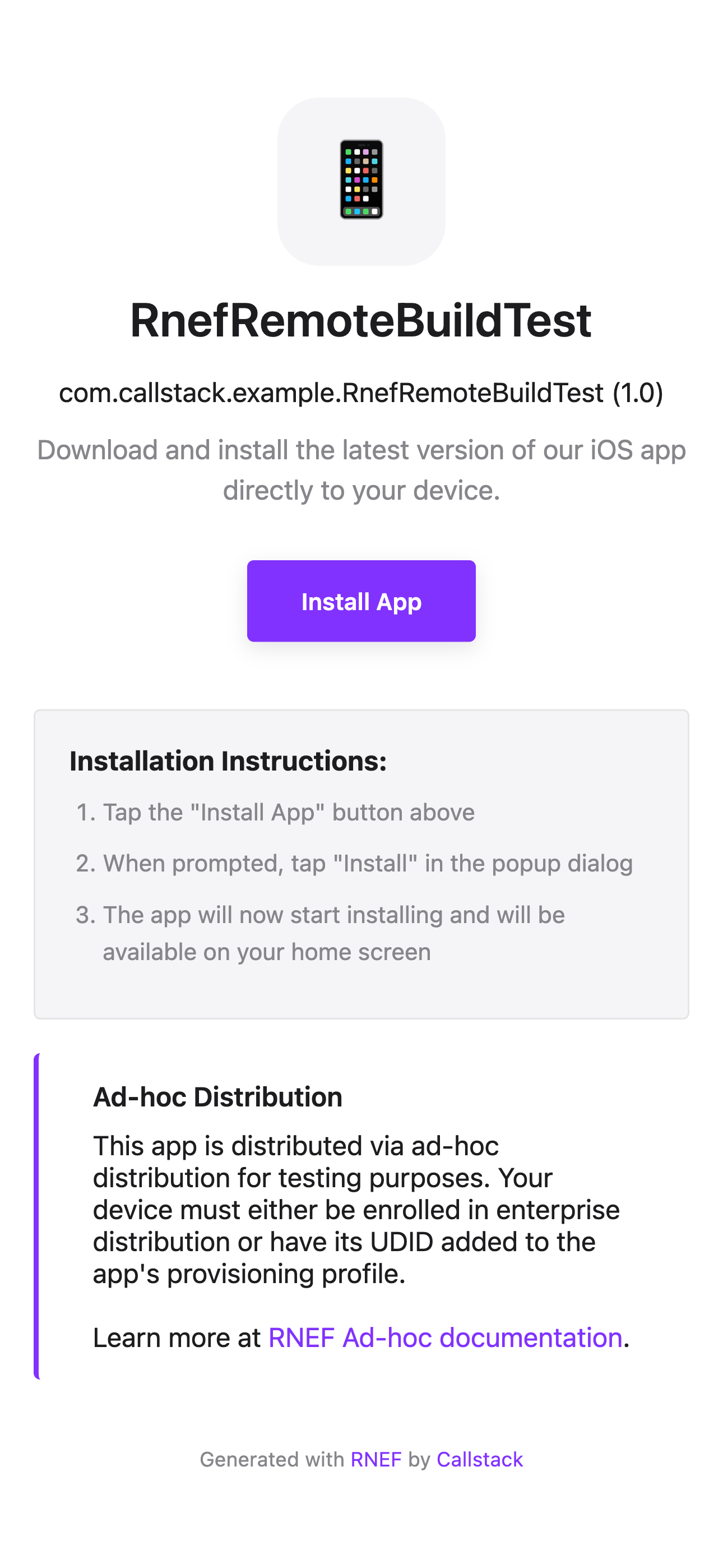 • Android: The signed APK at <directory>/ad-hoc/<artifactName>/<AppName>.apk and an index.html landing page